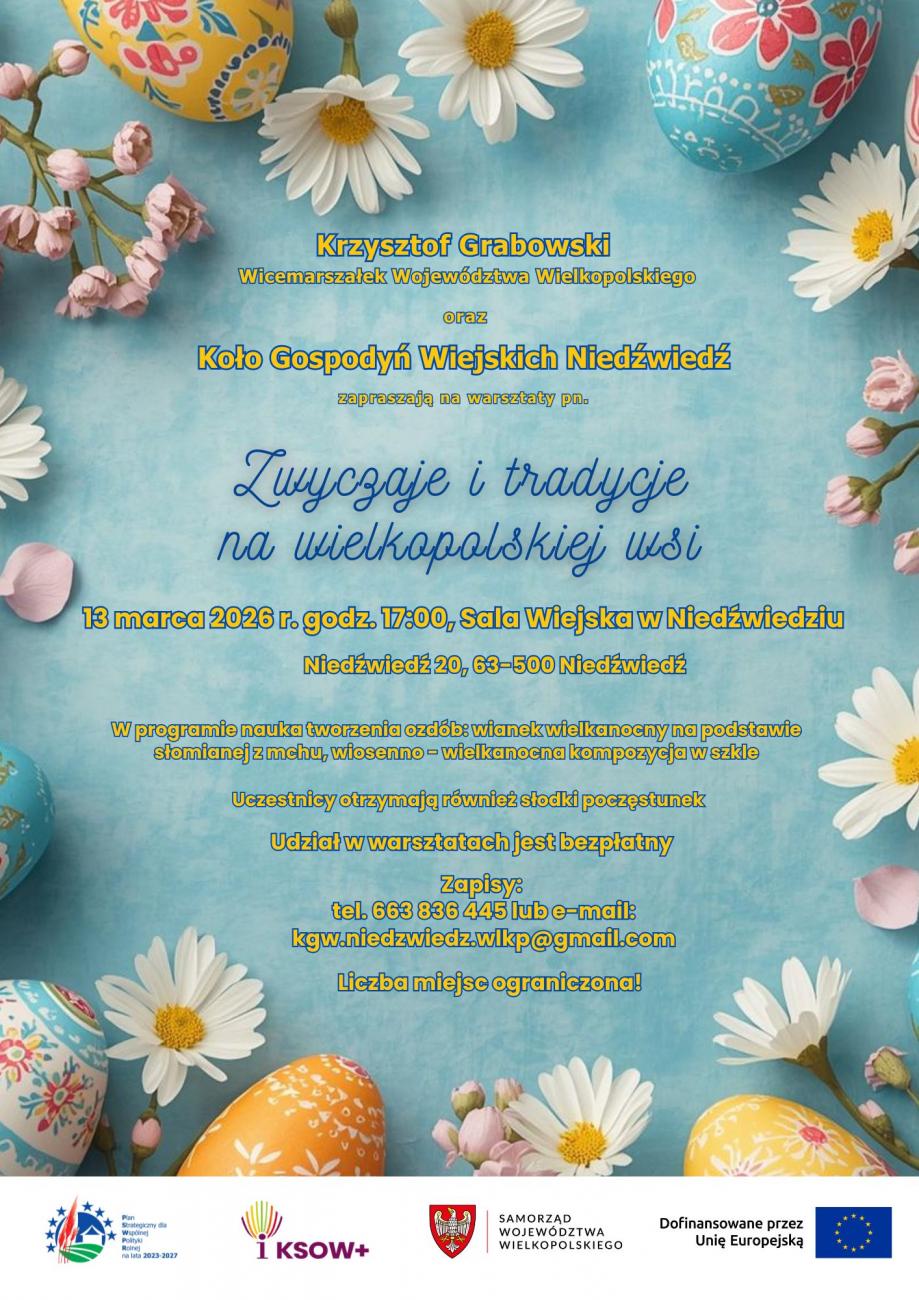 Wicemarszałek Województwa Wielkopolskiego Krzysztof Grabowski oraz Koło Gospodyń Wiejskich Niedźwiedź zapraszają na bezpłatne warsztaty „Zwyczaje i tradycje na wielkopolskiej wsi”, które odbędą się 13 marca 2026 r. o godz. 17:00 w Sali Wiejskiej w Niedźwiedziu. W programie m.in. nauka tworzenia ozdób wielkanocnych, wianka na słomianej podstawie z mchu oraz wiosenno-wielkanocnej kompozycji w szkle. Na uczestników czeka także słodki poczęstunek. Liczba miejsc ograniczona, więcej informacji dotyczących zapisów znajdą państwo poniżej na plakacie.