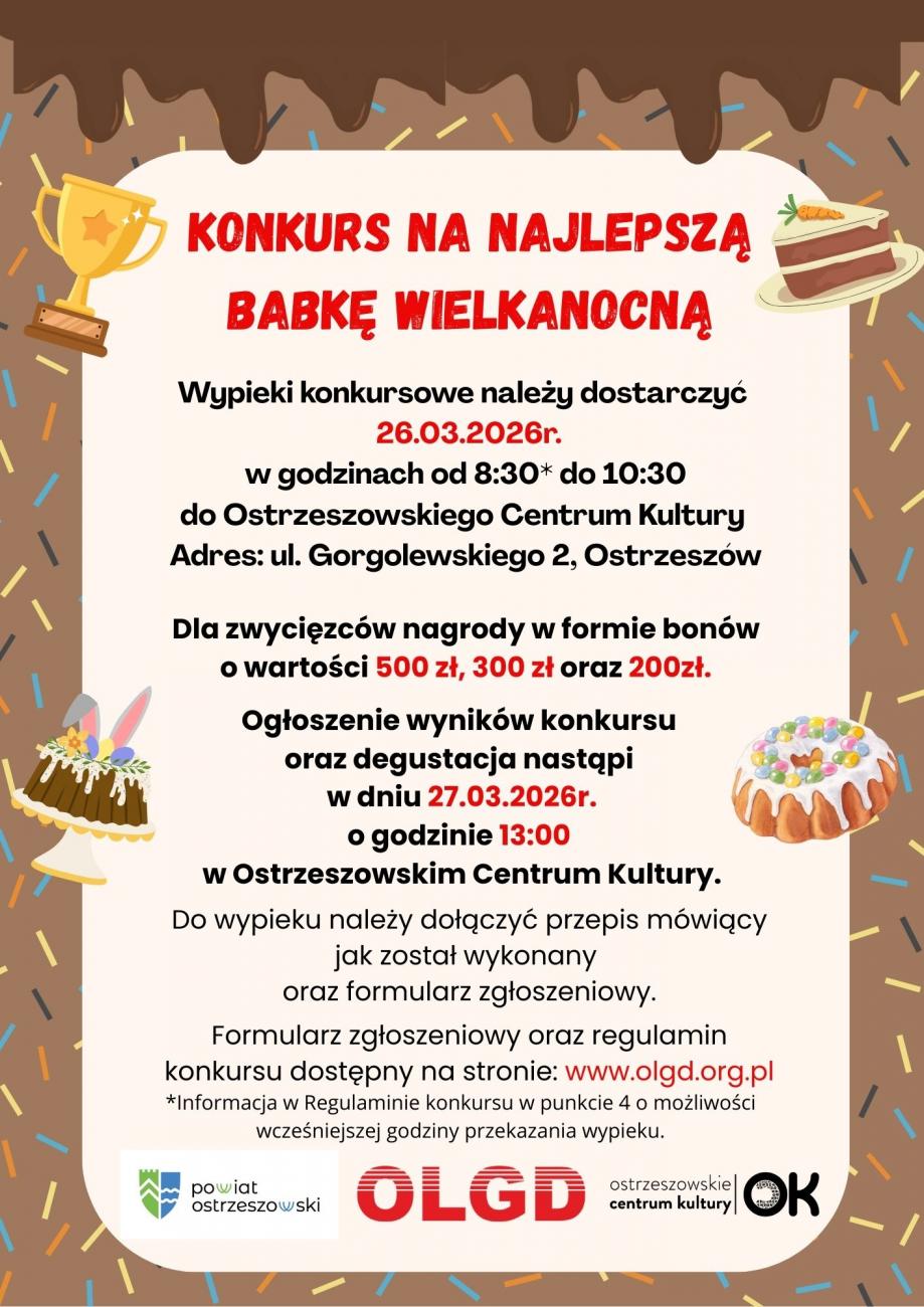 Stowarzyszenie "Ostrzeszowska Lokalna Grupa Działania wraz z Ostrzeszowskim Centrum Kultury zapraszają do udziału w Konkursie na Najlepszą Babkę Wielkanocną. Konkurs odbędzie się w Ostrzeszowskim Centrum Kultury z siedzibą: ul. Gorgolewskiego 2, 63-500 Ostrzeszów w dniu 26.03.2026 r. Wypieki konkursowe należy dostarczyć od godziny 8:30 do godziny 10:30.